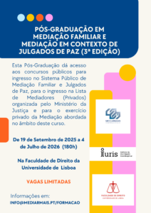 Pós-Graduação em Mediação Familiar e Mediação em Julgados de Paz (19 de setembro de 2025 a 4 de julho de 2026), em parceria com o Instituto de Investigação Interdisciplinar, na Faculdade de Direito de Lisboa